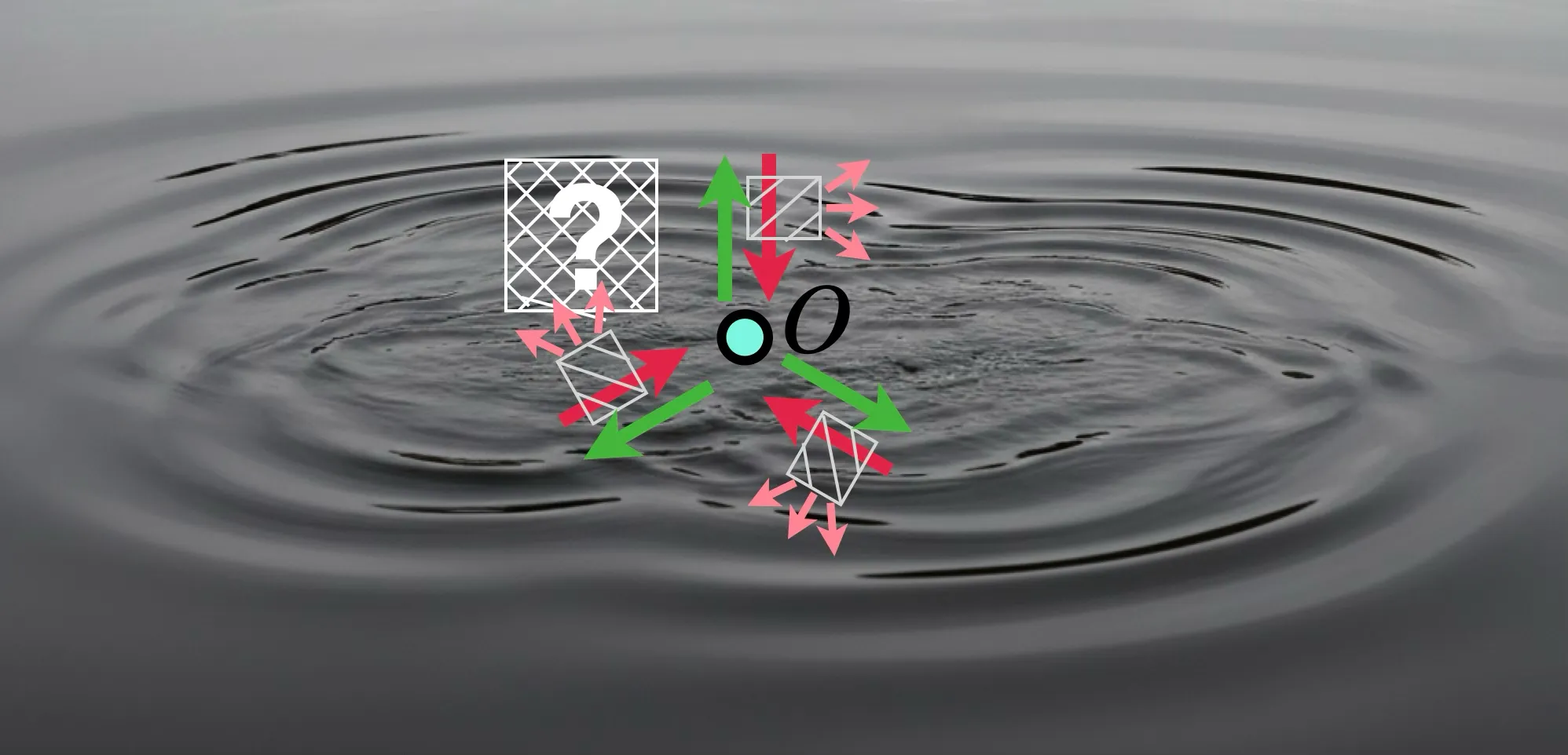 The flow of geometrical operator density in the heterogeneous structures resembles the complex (non-concentric) propagation of ripples on a water surface, with the interference effects and scattering (pink arrows) affecting the direction and the intensity of information spreading. The problem of operator hydrodynamics that we address in the experiment is to measure the integral operator density located in the chosen geometric area, for instance, one marked by a question mark “?”.