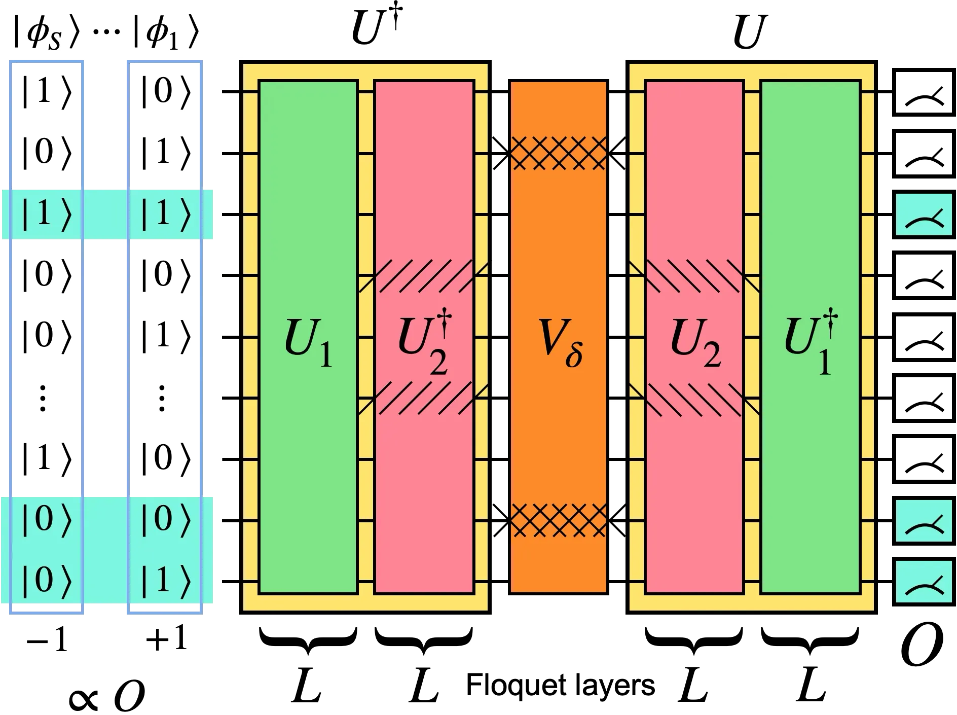 Algorithmiq’s design of the quantum experiment intended to probe the operator hydrodynamics with the operator Loschmidt echo and out-of-time-order correlation functions. Observable $O$ consits of $Z$ operators in the area ($V_O$. Preparation of a randomly chosen bitstring-state. Evolution of the state under $U V\delta U^\dagger$ results in the output that can be measured in the computational basis. Averaging the parity of the input bitstring times the observable estimation provides the OLE estimation and its statistical error._