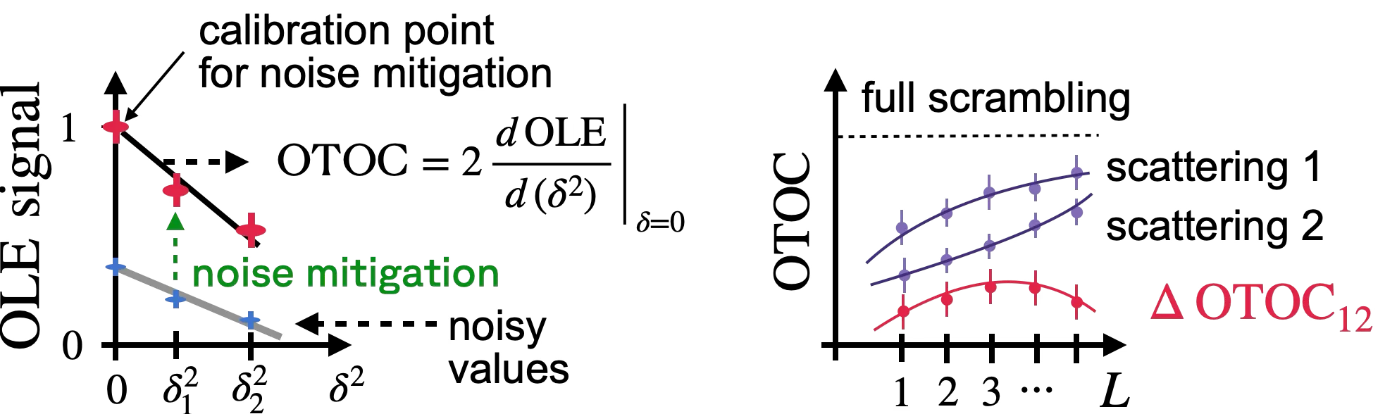 Left: Extraction of OTOC from OLE signals for different values of $\delta$. Global rescaling of the noisy signals with respect to that for $\delta=0$ is the simplest noise-structure-agnostic error mitigation technique; however, there exist other noise-aware methods such as the tensor-network error mitigation (TEM, patented by Algorithmiq) that rely on the learnt structure of the noise and should provide a confidence interval for the mitigated values. Importantly, all error-mitigation techniques have a calibration point at $\delta=0$ since the whole circuit reduces to a mirror circuit. Right: Revealing the physics of scattering. L quantifies the number of Floquet layers in $U_1$ and $U_2$. Full scrambling assumption poses the upper bound for OTOC, $2|V_P|$. Scattering on different elements of the structure (regimes 1 and 2) results in different OTOC values. The difference $\Delta$OTOC between those OTOCs in reasonably shallow circuits is challenging for all known classical methods.
