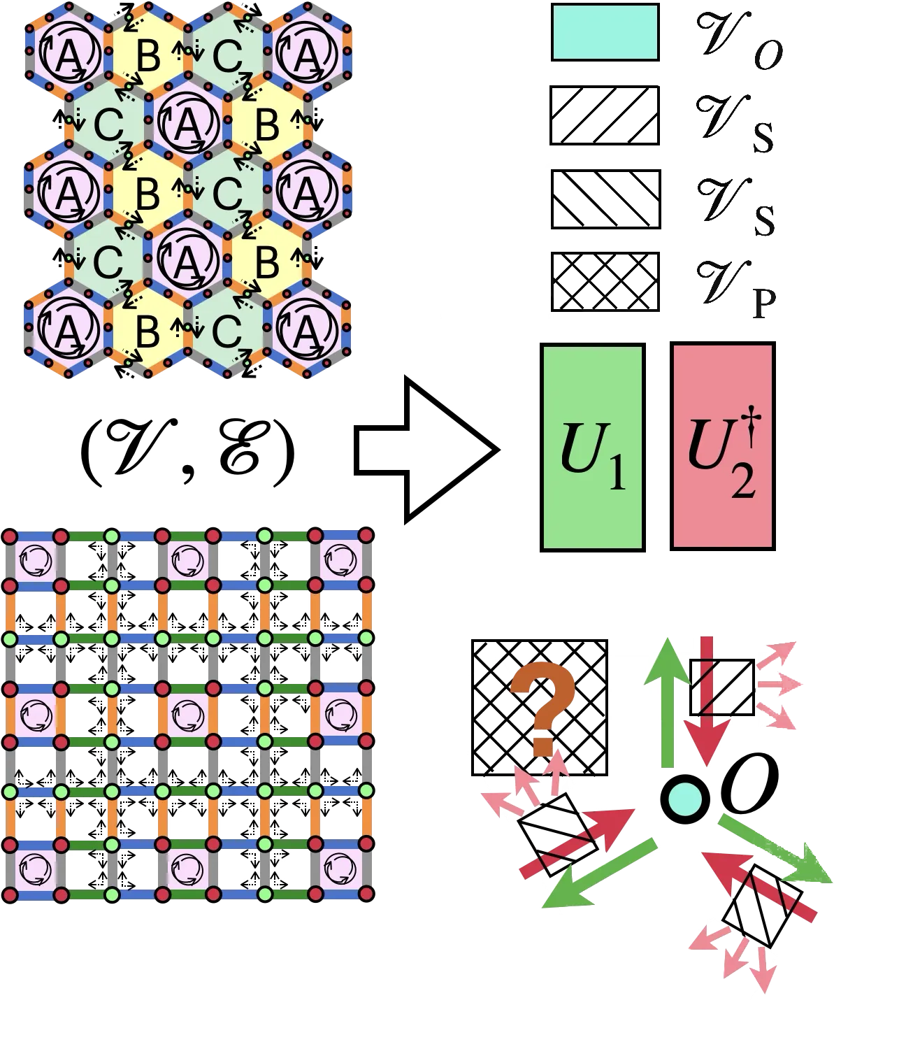 This figure clarifies the problem of operator hydrodynamics in materials. Graph structure $ (V,E) $ of the heterogeneous material defines scrambling ($U_1$) and unscrambling ($U_2$) evolutions—a combination of which manifests in the destructive interference effects—that are hard to capture with the classical methods. The difference between $U_1$ and $U_2$ in the overall dynamics $U^\dagger = U_2^\dagger U_1$ for an observable O (originally landing on vertices $V_O$) is in the presence of scattering on some of the vertices ($V_S$) or the edges ($E_S$) in $U_2^\dagger$. The physical question is to probe how much of the operator density is located in the geometric area $V_P$ _(marked by a question mark “?”) as a result of the eventual operator spreading $U^\dagger O U$.
